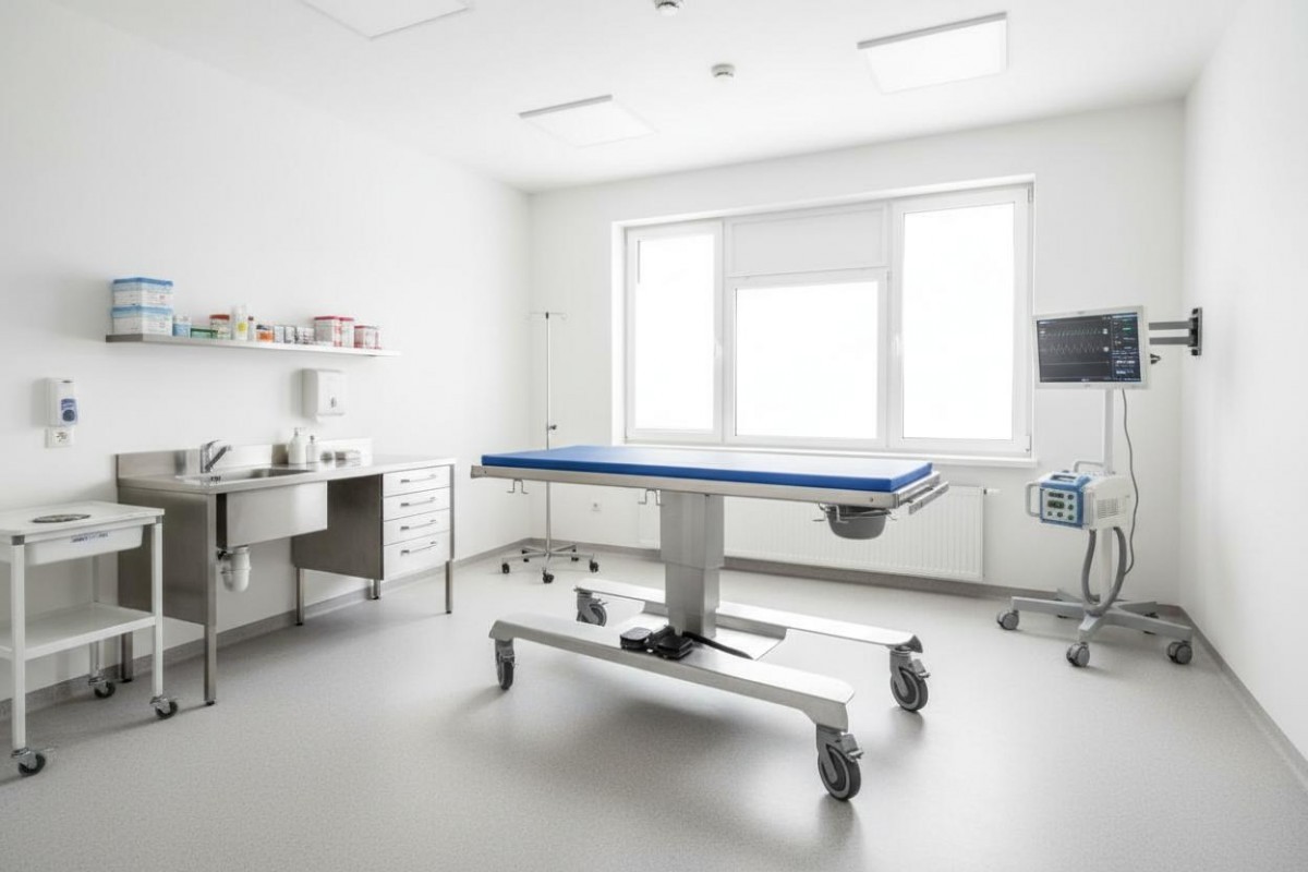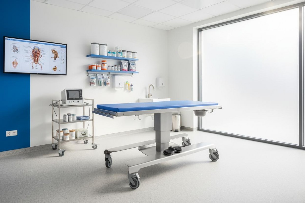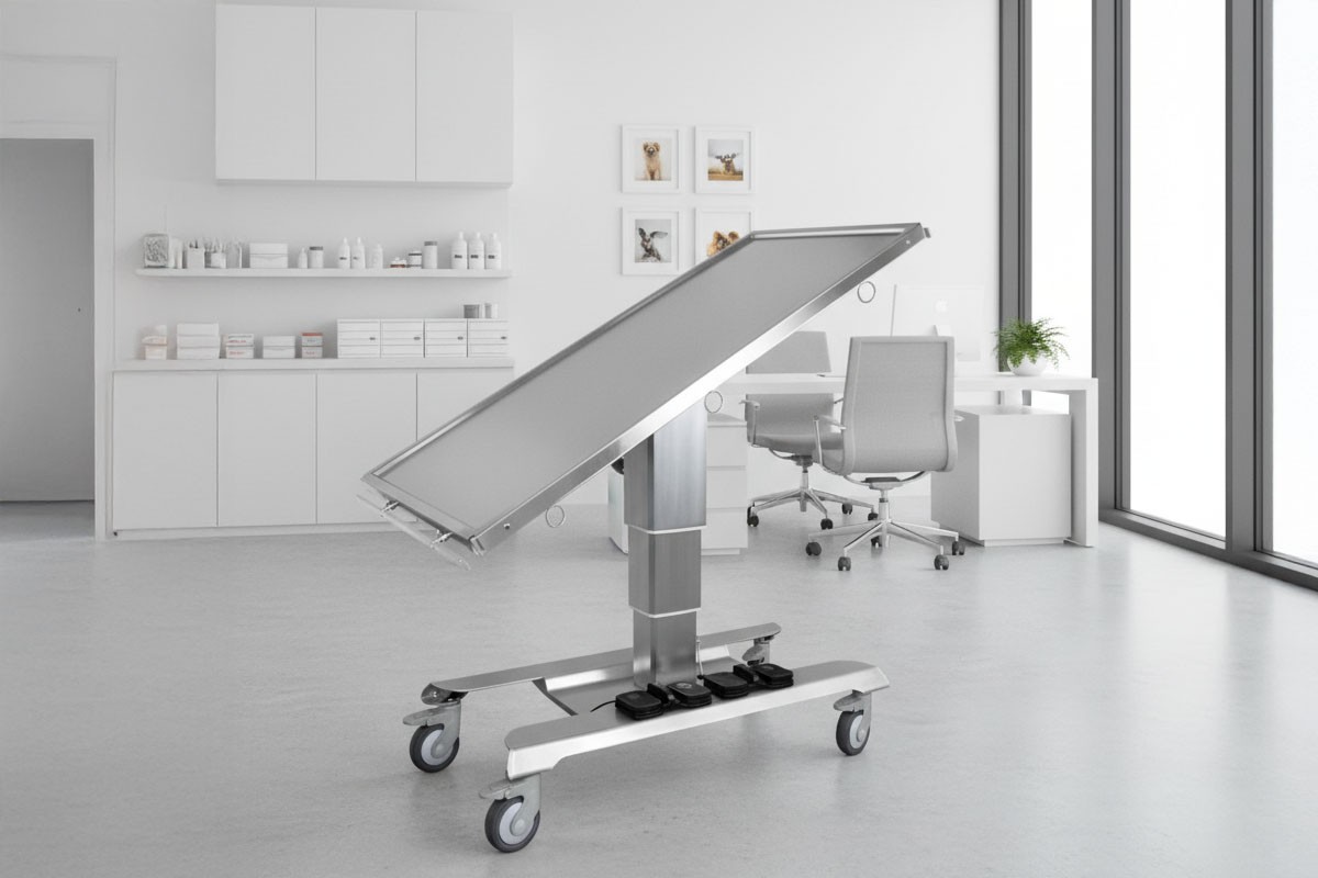 Thanks to the use of a durable lifting column, the URSO veterinary table is characterized by high stability. A removable foot pedal mounted on the base of the table is used for height adjustment.