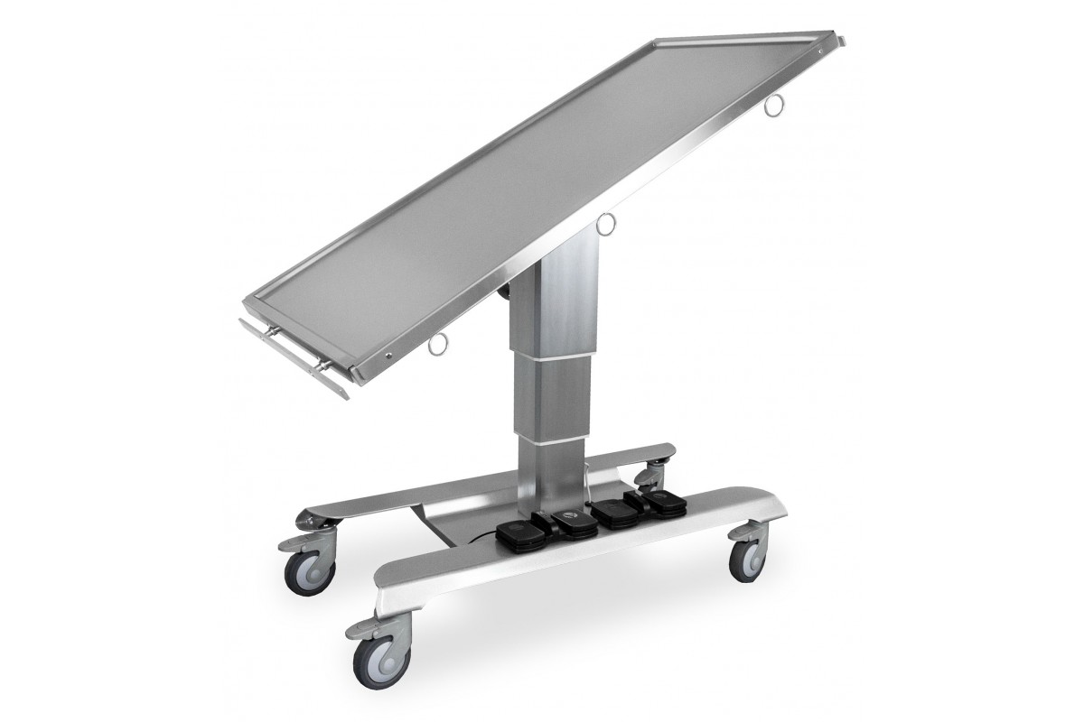 The URSO veterinary table is a model of a veterinary table with electric height adjustment. A distinctive feature of the table is the lifting column with a maximum load capacity of 200 kg. The table has a steel construction, coated with silver powder paint resistant to chipping and scratching. The table's structure is based on wheels with brakes, each having a diameter of 16 cm. The tabletop is made of stainless steel and includes two drainage holes. Two bowls are placed on the mounting brackets under the tabletop. Tie-down hooks are located on the longer sides of the tabletop, and rails for mounting additional accessories are at the ends of the table.